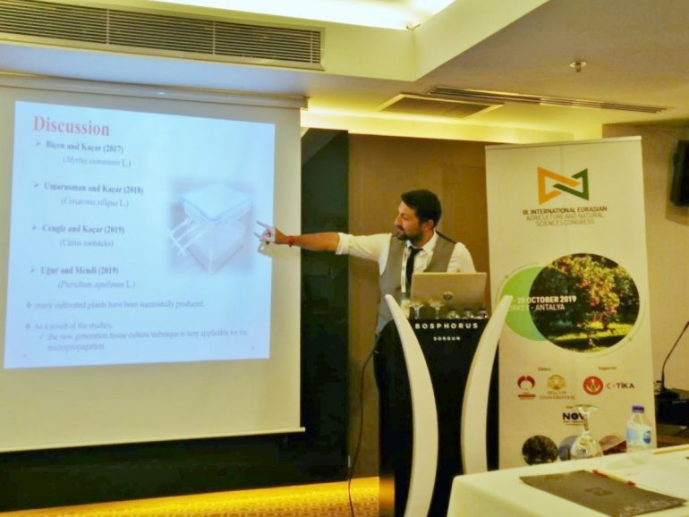 Tarım ve Doğa Bilimleri Fakültesi, Bitkisel Üretim ve Teknolojileri Bölümü araştırma görevlimiz Mustafa Alp Arslan Umarusman 17-20 Ekim 2019 tarihleri arasında Antalya'da gerçekleştirilen, üniversitemizin de düzenleyicileri arasında olduğu III. International Eurasian Agriculture and Natural Sciences Congress’de ''Micropropagation of Different Blackberry (Rubus fructicosus L.) Genotypes with the Classic and New Generation Tissue Culture Techniques '' ve '' Molecular Defense Reactions on Pears Against Erwinia amylovora Infection'' başlıklı sözlü sunumları yapmıştır.