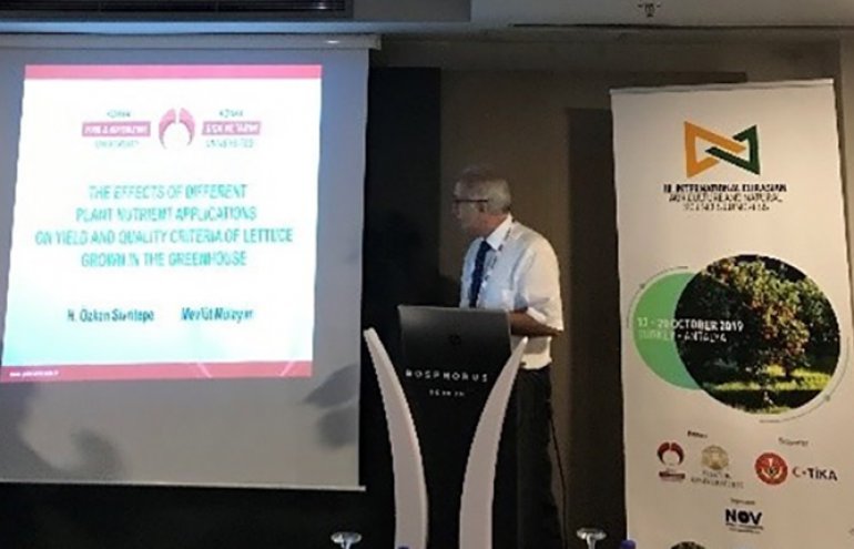 Tarım ve Doğa Bilimleri Fakültesi Dekanımız Prof. Dr. H. Özkan Sivritepe, Antalya’da Üniversitemizin de desteği ile 17-20 Ekim 2019 tarihleri arasında düzenlenen “III. International Eurasian Agriculture and Natural Sciences Congress” toplantısına katıldı. Prof. Dr. Özkan Sivritepe kongrede “The Effects of Different Plant Nutrient Applications on Yield and Quality Criteria of Lettuce Grown in the Greenhouse” başlıklı bir sözlü bildiri sunarken, kongrenin iki oturumunda başkanlık yaptı.